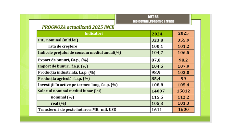 Conform exercițiului de prognoză realizat de cercetătorii științifici ai Institutului Național de Cercetări Economice, ASEM, economia națională a Republicii Moldova este preconizată să înregistreze o creștere de 1,2% în termeni reali în anul 2025 comparativ cu anul precedent, ceea ce indică o redresare lentă, afectată de contracția agriculturii, stagnarea cererii externe și inflația mai ridicată decât anticipată.